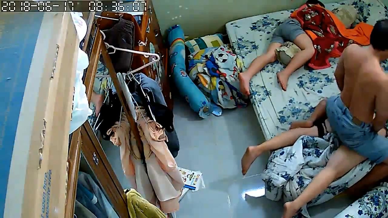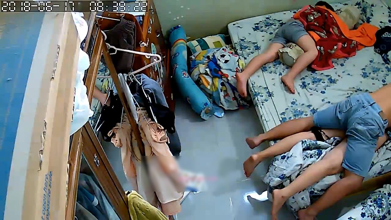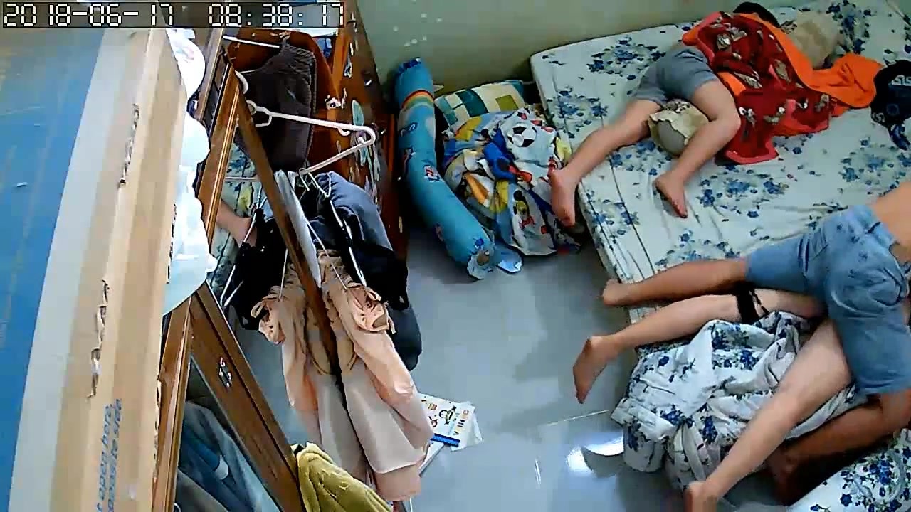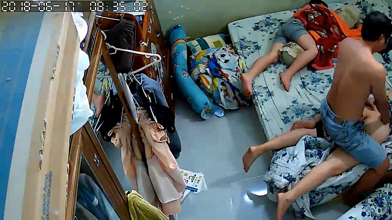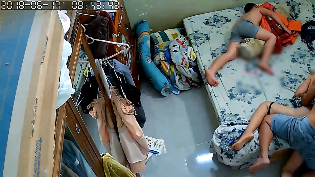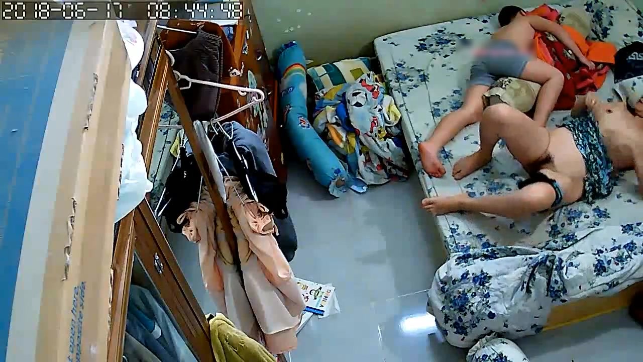 黑客破解家庭网络摄像头性欲很强的秃顶大叔大白天儿子睡旁边不脱裤子也要和老婆来一炮